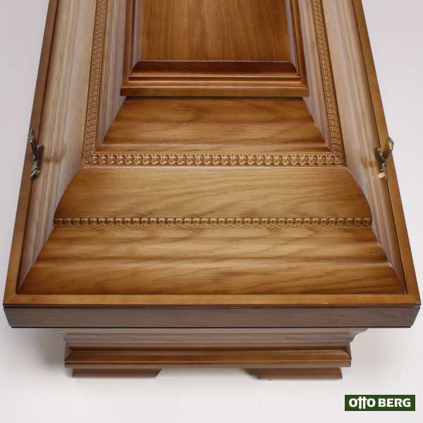 Hochwertiger Sarg aus Kiefernholz, gekehlter Obersarg mit breiter Leiste und eingelegten Zierleisten und 6 Sarggriffen.